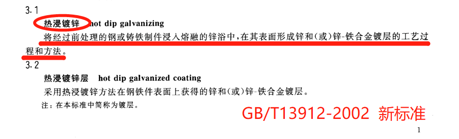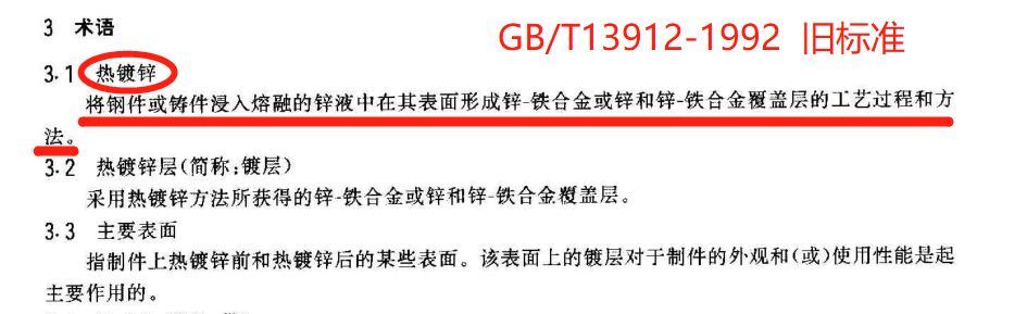 这两段话本质的意思是一样的,只是两份标准对“热镀锌”和“热浸镀锌”这两个话术做了改变,从这里可以说明“热镀锌”这个话术被“热浸镀锌”替代了。
