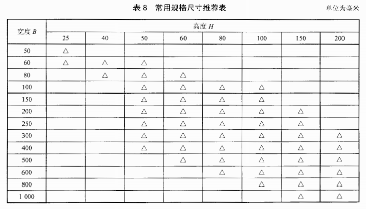 桥架的宽度与高度常用规格尺寸的推荐见表8中符号“△”的规定。典型图例参见附录A。