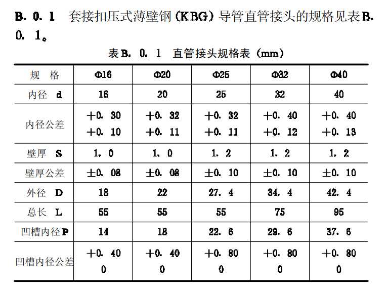 内容来源于《CECS100:98套接扣压式薄壁钢导管电线管路施工及验收规范》国家标准 附录B.0.1套接扣压式薄壁钢(KBG)导管直管接头规格
