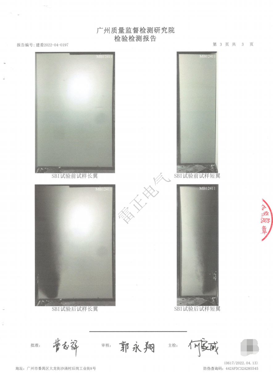 备注:SBI试样安装说明:试样采用机械方式紧固在燃烧性能为Al级的基材上,基材紧贴背板进行安装)