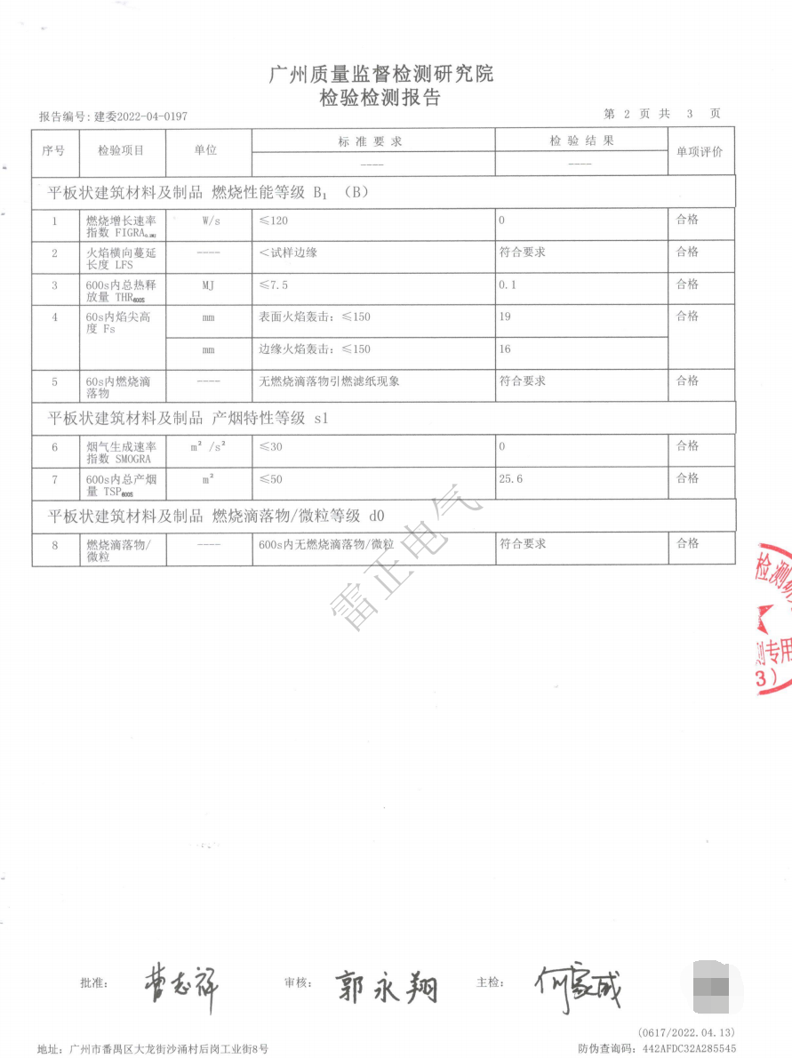 检验结论:所检项目符合《2012建筑材料及制品燃烧性能分级》标准[平板状建筑材料B(B-s1,d0)级]要求。
