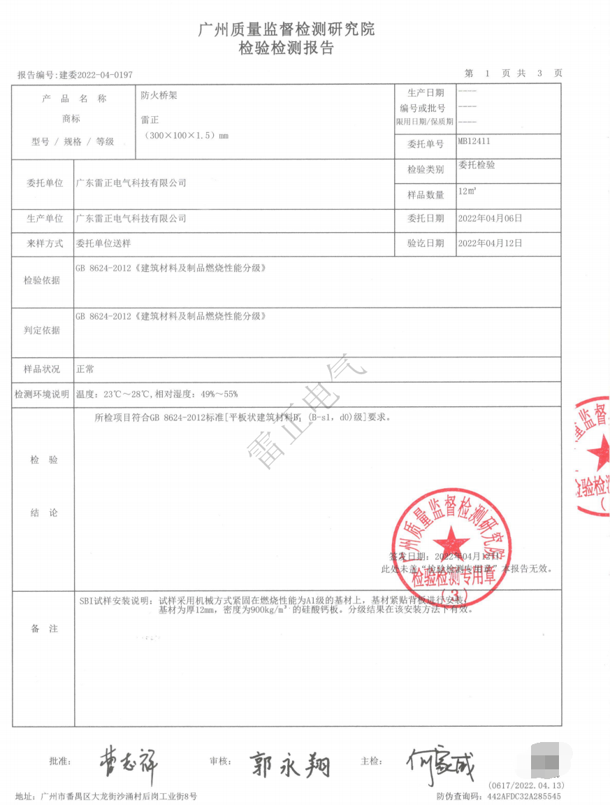 防火桥架检测报告所检项目符合《2012建筑材料及制品燃烧性能分级》这份标准