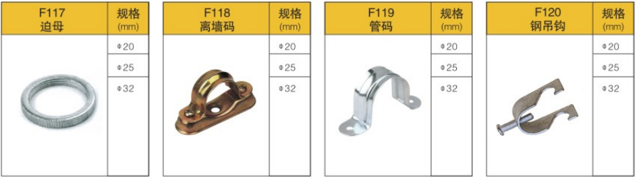 单点紧定直接、单点紧定盒接、单点紧定弯通、双点紧固直接、双点紧固盒接、单边地线夹、双边地线夹、拉伸线盒快速直接、带护咀盒接、镀锌直通、86系列大线盒、焊接线盒、明装CK盒、双位盒、(147型)线盒、迫母、离墙码、管码、钢吊钩。