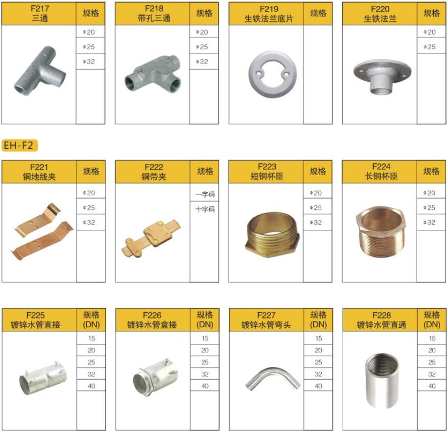 热镀锌直通、热镀锌离墙码、热镀锌迫母、平面明制、双位明制箱、斜口明制箱、生铁过路箱、高身司令箱、低身司令箱、异型司令箱、特别型司令箱、BS4662接线盒、明装方型箱盖、暗装圆形箱盖、直角弯头、带孔直角弯、三通、带孔三通、生铁法兰底片、生铁法兰、铜地线夹、铜带夹、短铜杯臣、长铜杯臣、镀锌水管直接、镀锌水管盒接、镀锌水管弯头、镀锌水管直通。