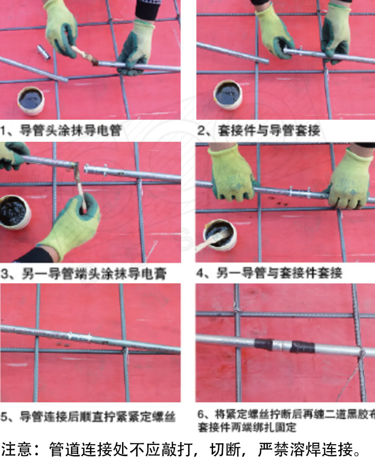 根据其连接方式的特点,配管套接件与管材间的严密性是预埋的关键,套接件与管壁紧定后,若管外径与管件内径尺寸不吻合,会有缝隙产生,在施工配管时,将配管套接连接工艺作为重点防控对象,采取对该部位多重加固措施:对所施工的每一个套接件必须涂抹导电膏,紧固后再缠二道黑胶布,防止套接缝隙漏浆堵塞配管或选择质量符合标准规范的尺寸精确的管件,更不要在管件中放密封圈,因胶圈无固定、易错位,容易堵塞通路、阻碍放线。JDG管连接预埋施工若按照下图操作过程控制,这点瑕疵完全是可控的,同时也满足工程质量要求。