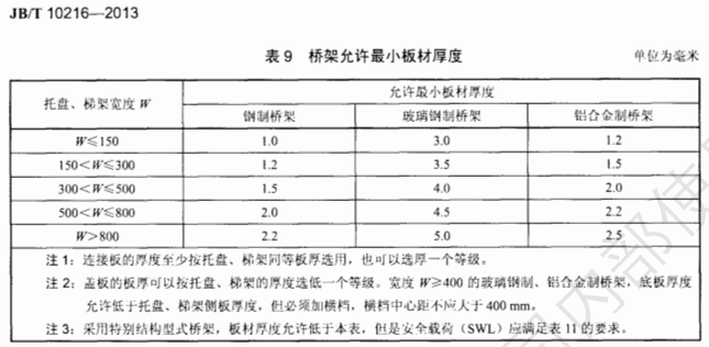 注3:采用特别结构型式桥架,板材厚度允许低于本表,但是安全载荷(SWL) 应满足表11的要求。